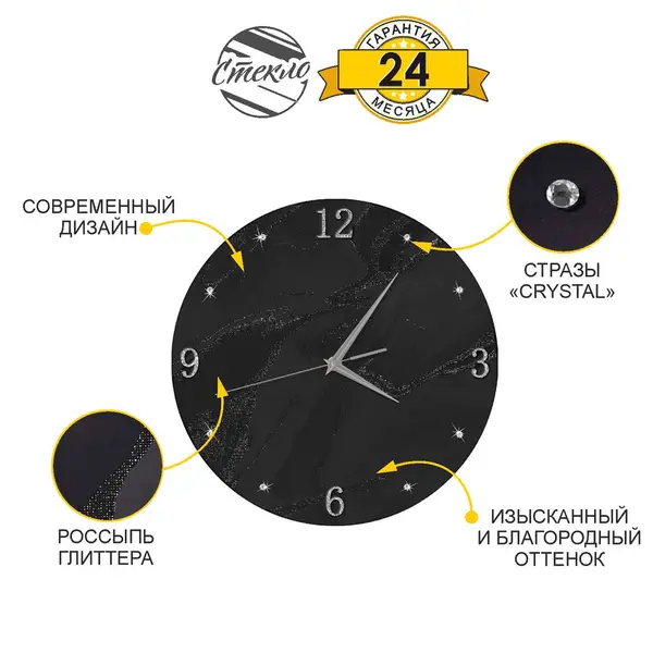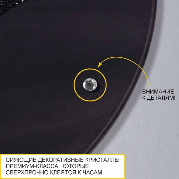 • Сияющие декоративные стразы "Crystal" премиум-класса придают настенным часам изысканный вид. Стразы сверхпрочно клеятся к стеклу.
