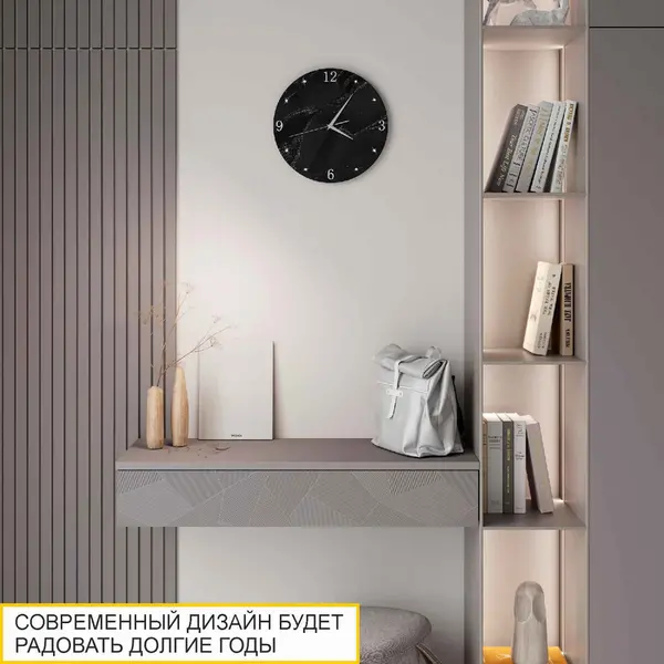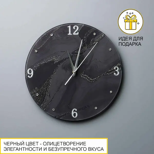 Часы настенные бесшумные выполнены в черном цвете. Это олицетворение элегантности и безупречного вкуса. Его можно сочетать с любыми другими цветами и фактурами. Часы могут не только показывать время, они станут красивым акцентом, элементом декора для дома или офиса. Они также могут использоваться в качестве оригинального подарка для коллег и близких.