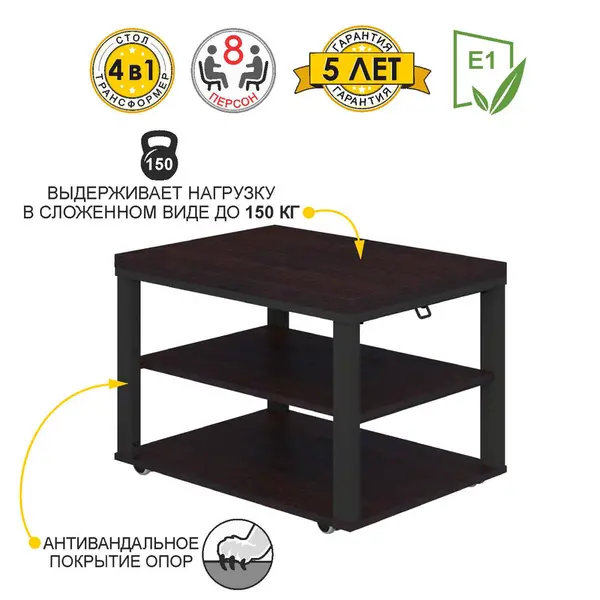 • Раскладной журнальный стол-трансформер легко превращается в обеденный или письменный стол и имеет четыре варианта трансформации. За одну цену Вы приобретаете 4 стола: 2 журнальных – один компактный, второй – с увеличенной столешницей, а также 2 обеденных стола на 4 и 8 персон.