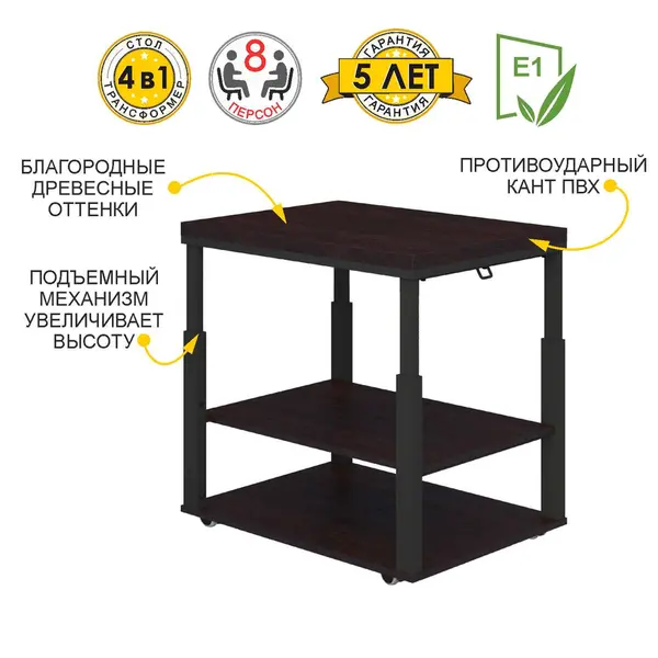 • Усиленные поворотные колеса со стопором позволяют зафиксировать стол в нужном положении для удобства его трансформации. Мебель проходит многочисленные испытания и тесты на качество. Гарантия качества от производителя – 5 лет. Это значительно больше, чем у многих производителей.