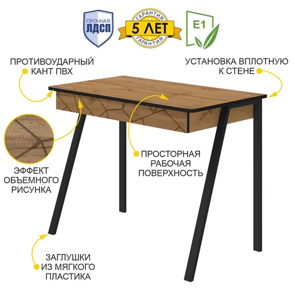 Благодаря современному дизайну и утонченному внешнему виду письменный стол гармонично впишется в любой интерьер. Это универсальный вариант для любых пространств и отличное решение для тех, кто хочет идти в ногу со временем. Имитация натуральной древесной текстуры создает ощущение уюта. Природная красота экостиля добавляет модную нотку Вашему интерьеру.