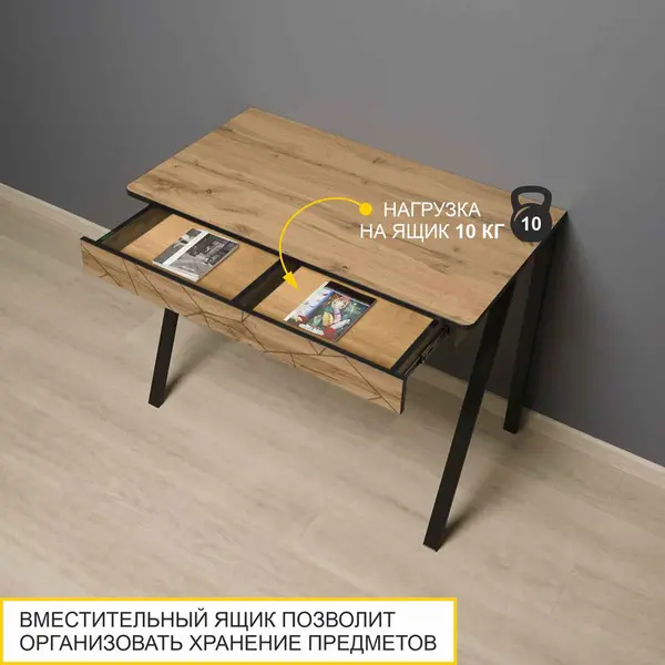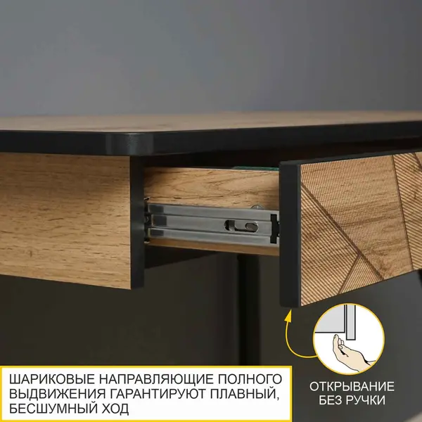 • Отсутствие лицевой фурнитуры подчеркивает современный дизайн письменного стола с ящиком. Ящик легко и удобно открывается за счет свеса фасада.