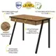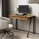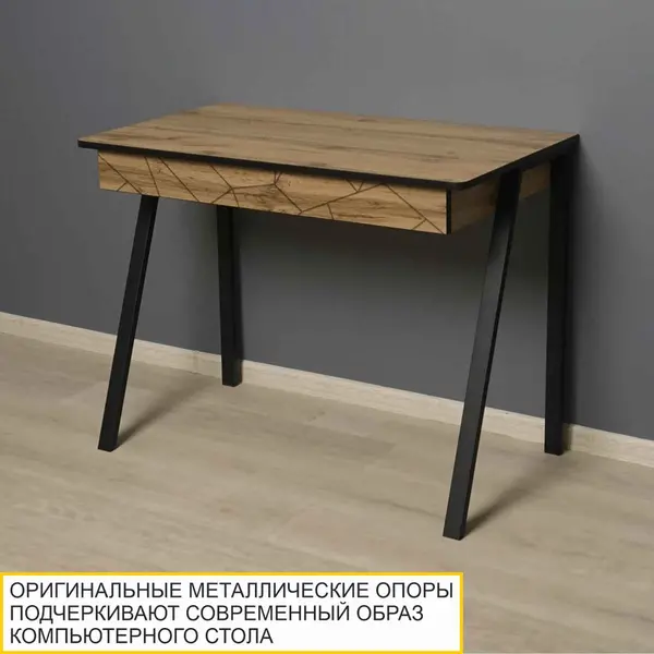 Компьютерный стол выполнен в теплых оттенках натурального дерева, которые создают уютную атмосферу и ощущение близости к природе, а контрастные металлические опоры черного цвета подчеркивают стильный дизайн изделия.