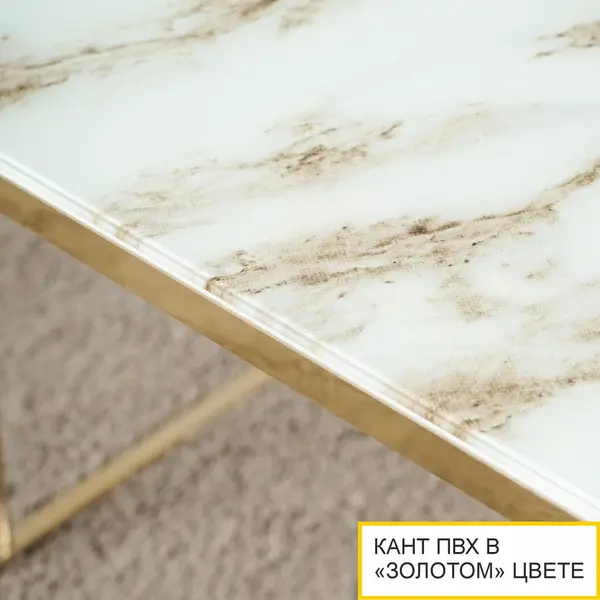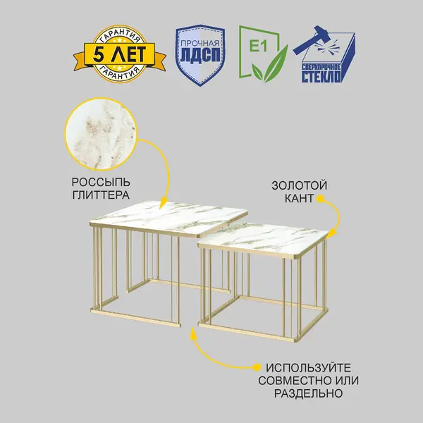 Одной из главных особенностей столиков является россыпь глиттера, которая придаёт их поверхности дополнительный блеск и делает по-настоящему уникальными. Рисунок мрамор создает эффект натурального камня, добавляя в Ваш интерьер нотки роскоши и утончённости. Золотой кант из ПВХ не только завершает дизайн, но и защищает края от повреждений, что делает столы более долговечными.