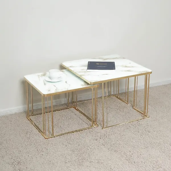 Журнальный стол Рим 45 - это идеальное решение для тех, кто ценит стиль и функциональность в интерьере. Этот комплект квадратных столиков станет не только практичным элементом вашей гостиной, но и настоящим украшением. Журнальные столики выполнены в элегантном цвете белого мрамора с золотыми ножками, что придаёт им особую изысканность.