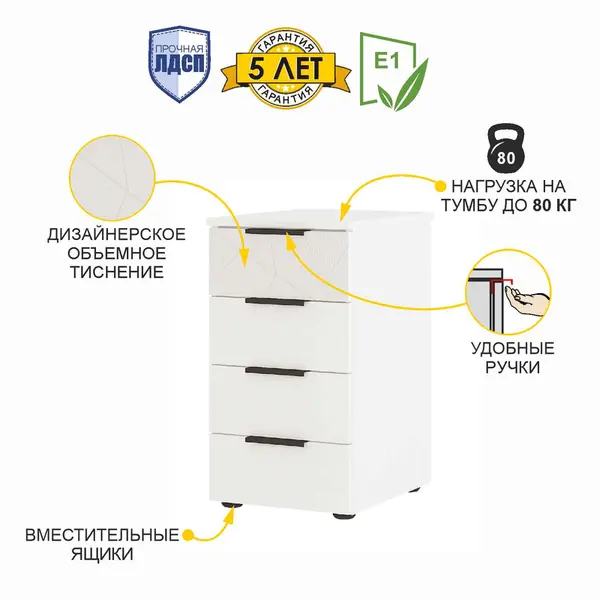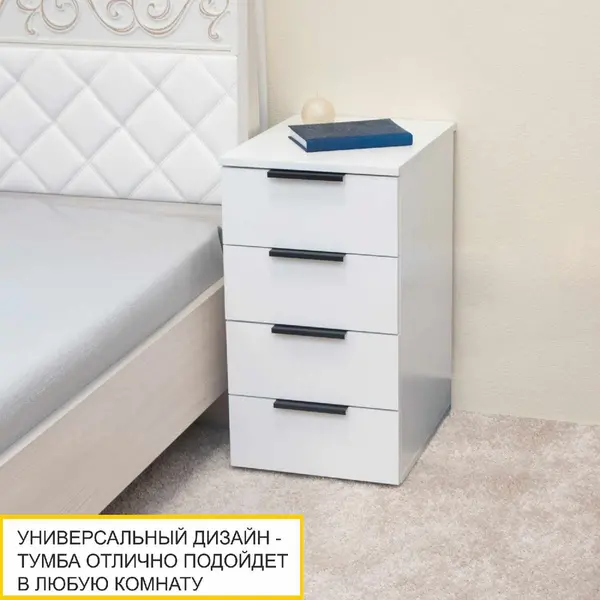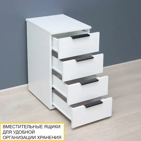 • Тумба оснащена четырьмя вместительными ящиками, что позволяет удобно организовать хранение важных предметов.