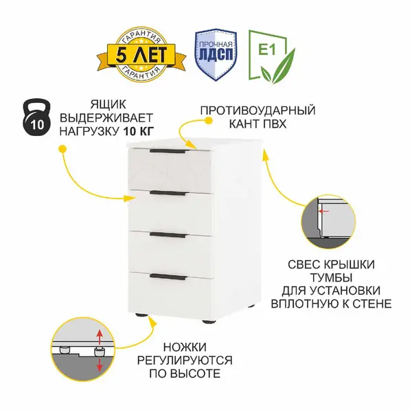 • Тумба изготовлена из ЛДСП повышенной прочности толщиной 16 мм. Материал устойчив к механическому истиранию и термическому воздействию.
