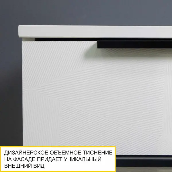 • Дизайнерское объемное тиснение на фасаде верхнего ящика подчеркивает современный стиль изделия и добавляет ему оригинальности. Рельефный рисунок придает уникальный внешний вид Вашему изделию, а также обладает приятной на ощупь текстурой.