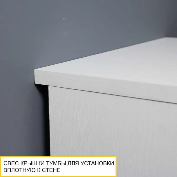 • Свес крышки тумбы позволяет установить изделие вплотную к стене даже с плинтусом. Зазор между стеной и тумбой рассчитан таким образом, чтобы было удобно располагать различные провода от техники, а также напольный плинтус.