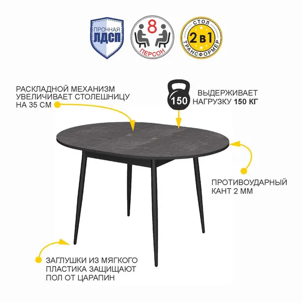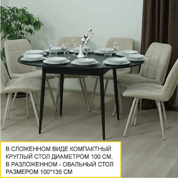 • За одну цену вы приобретаете 2 стола! В сложенном виде – это компактный круглый стол диаметром 100 см. Надежный механизм синхронного раздвижения и вставки-книжки позволит трансформировать столик во вместительный овальный стол с размером столешницы 100х135 см, что позволит разместить за столом до 8 персон.