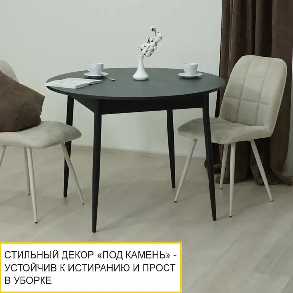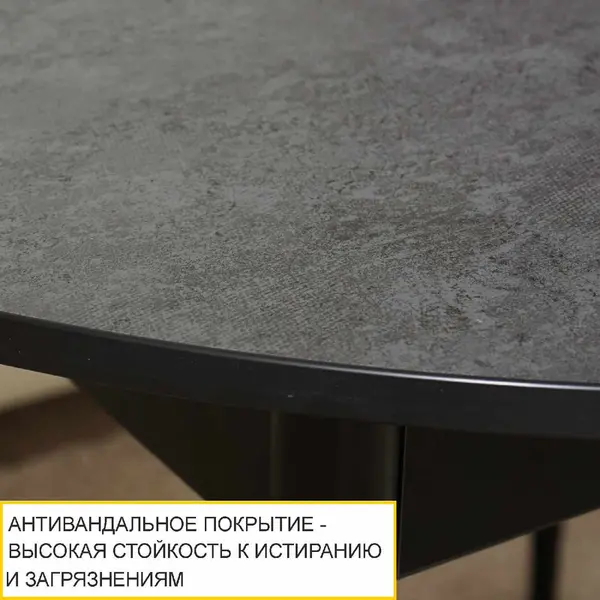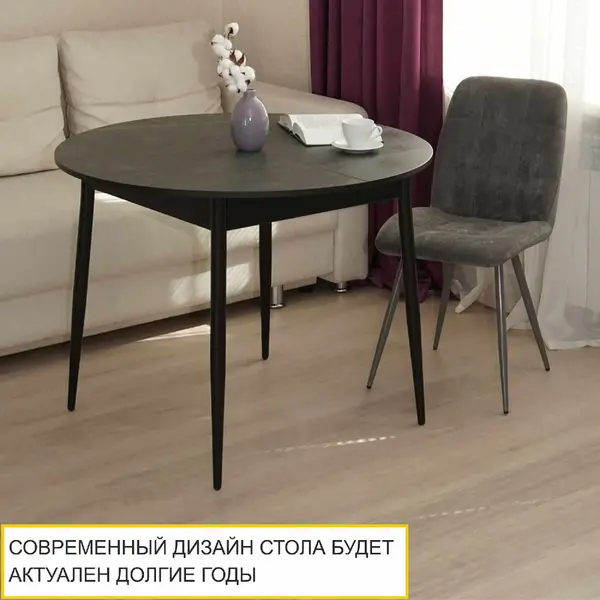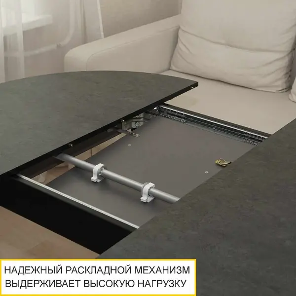 Раздвижной обеденный стол, выполненный в современном сером цвете способен наполнить интерьер ощущением спокойствия и стабильности. Используя серый цвет в интерьере, Вы легко создадите стильный и универсальный дизайн. Столешница круглой формы цвета «Антрацит» с объемным декором «под камень» придает изделию современный внешний вид, обладает приятной на ощупь текстурой, при этом устойчива к истиранию и очень проста в уборке.