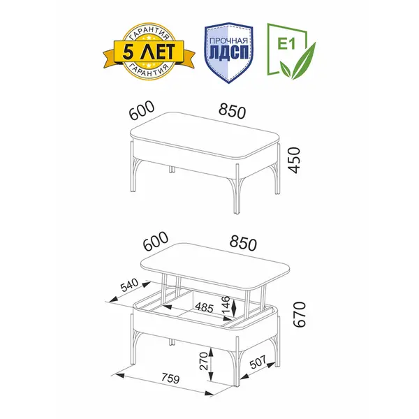 • За одну цену Вы приобретаете 2 стола! В сложенном виде – это компактный журнальный стол. А в разложенном виде надежный подъемный механизм увеличивает высоту стола на 22 см, что позволяет его использовать как обеденный или письменный стол.