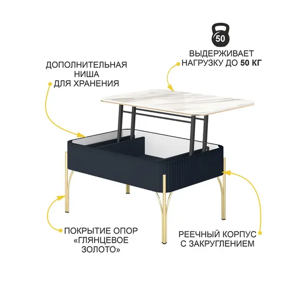 • Оригинальные металлические опоры дополняют общую концепцию изделия. Глянцевое золото придает роскошный вид опорам, привлекает внимание и добавляет изысканности столу трансформеру для гостинной.
