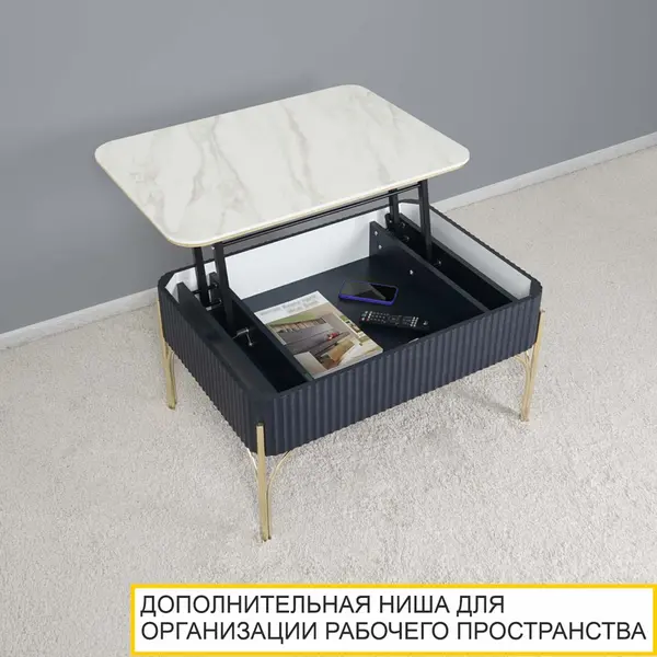 • Дополнительная ниша для хранения в журнальном столике трансформере помогает организовать рабочее пространство. С ее помощью можно скрыть лишние предметы, улучшить эргономику рабочего места и создать эстетичный вид.