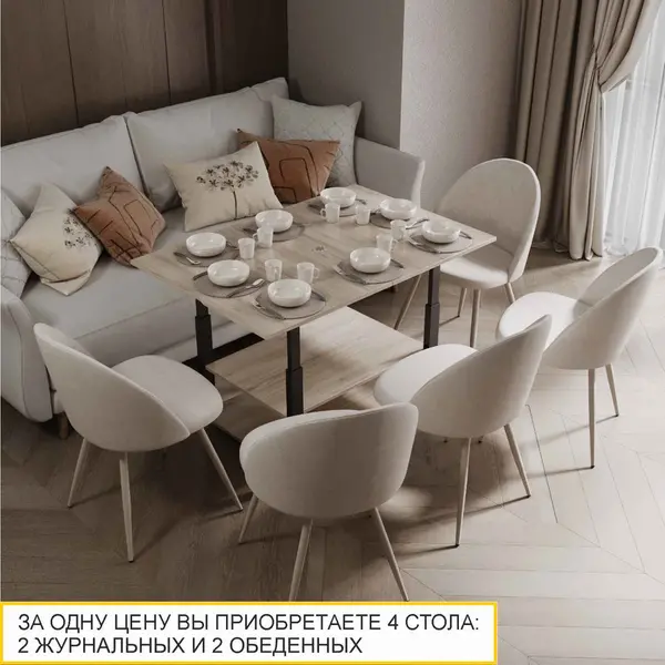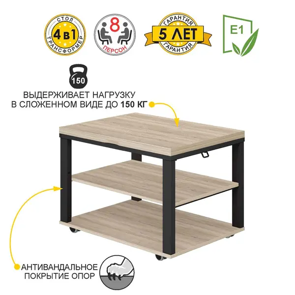 • Раскладной журнальный стол-трансформер легко превращается в обеденный или письменный стол и имеет четыре варианта трансформации. За одну цену Вы приобретаете 4 стола: 2 журнальных – один компактный, второй – с увеличенной столешницей, а также 2 обеденных стола на 4 и 8 персон.