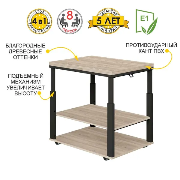 • Усиленные поворотные колеса со стопором позволяют зафиксировать стол в нужном положении для удобства его трансформации. Мебель проходит многочисленные испытания и тесты на качество. Гарантия качества от производителя – 5 лет. Это значительно больше, чем у многих производителей.