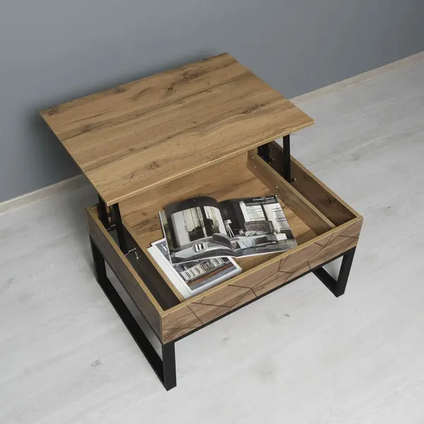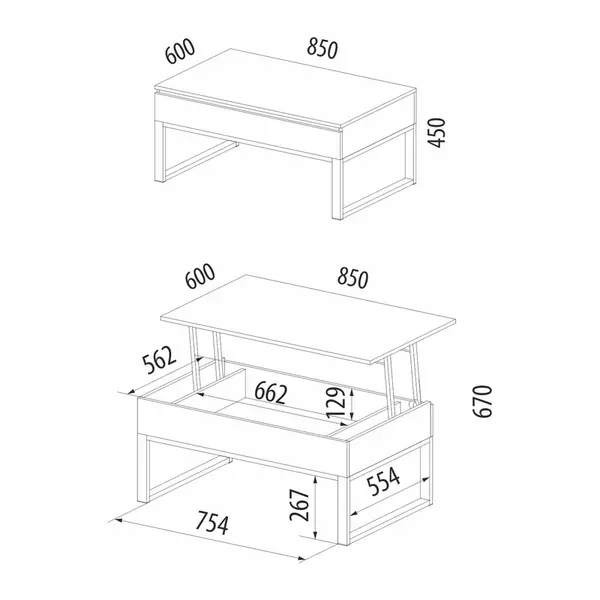 • За одну цену Вы приобретаете 2 стола! В сложенном виде – это компактный журнальный стол. А в разложенном виде надежный подъемный механизм увеличивает высоту стола на 22 см, что позволяет его использовать как обеденный или письменный стол.