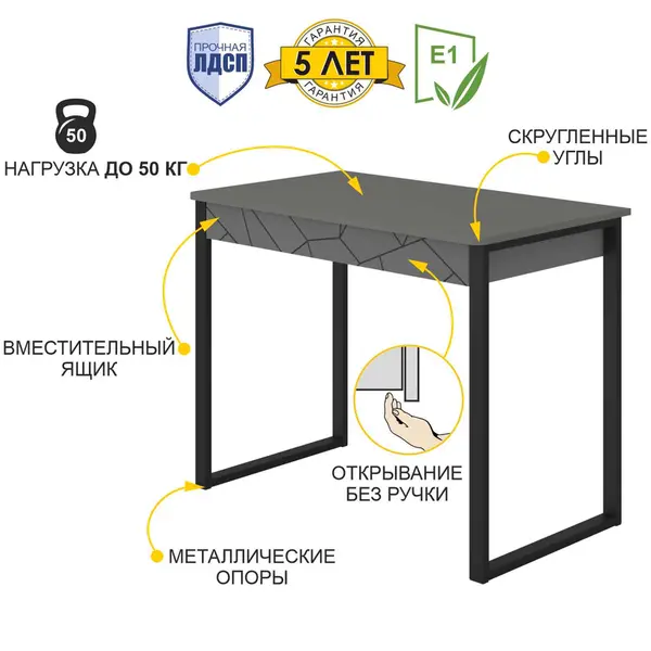 • Столешница письменного стола толщиной 16 мм устойчива к нагрузкам до 50 кг, что делает ее прочной и надежной.