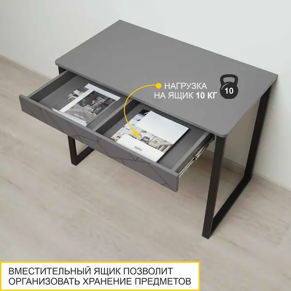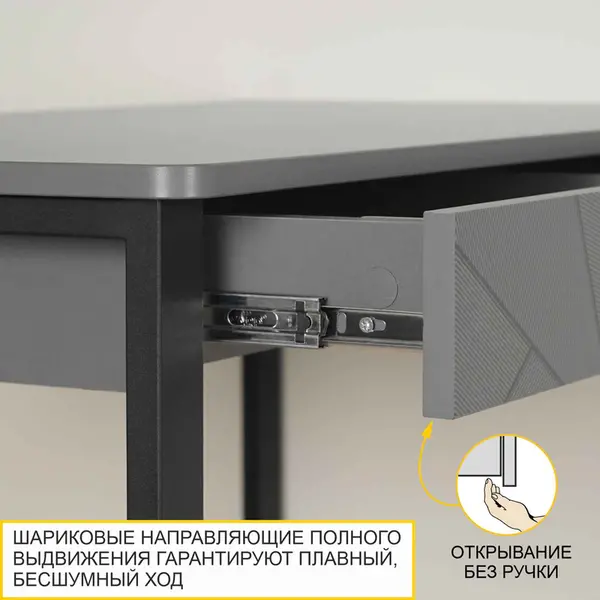 • Отсутствие лицевой фурнитуры подчеркивает современный дизайн письменного стола с ящиком. Ящик легко и удобно открывается за счет свеса фасада.
