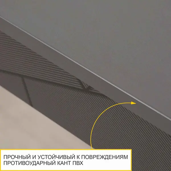 • Противоударный кант ПВХ 0,4 мм и 2 мм защищает края изделия от сколов и влаги, увеличивает срок эксплуатации изделия и сохраняет его внешний вид на долгие годы.