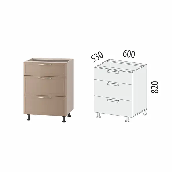 • Высота напольных шкафов составляет 820 мм (без столешницы), что обеспечивает комфортный процесс приготовления пищи.