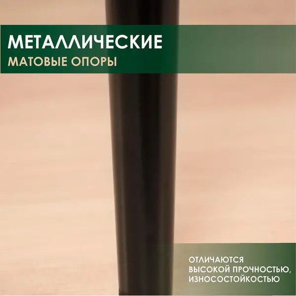 Обеденный стол выполнен в теплых оттенках натурального дерева. Такие оттенки создают уютную атмосферу и ощущение близости к природе, а контрастные металлические опоры черного цвета подчеркивают стильный дизайн изделия.