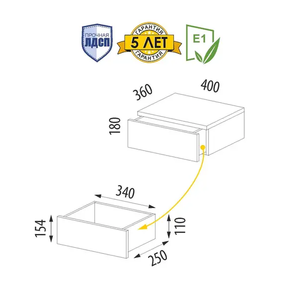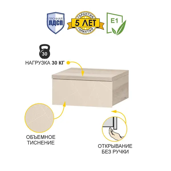 • Корпус консоли подвесной в спальню выполнен из ЛДСП 16 мм повышенной прочности. Данный материал безопасен для здоровья и рекомендован к производству мебели для кухни, спальни, прихожих и детских комнат, устойчив к механическому истиранию и термическому воздействию. Выдерживает min 200 циклов истирания (по ГОСТу min 65) – это больше, чем у многих производителей. Выдерживает многократную сборку - при переезде не возникнет проблем.