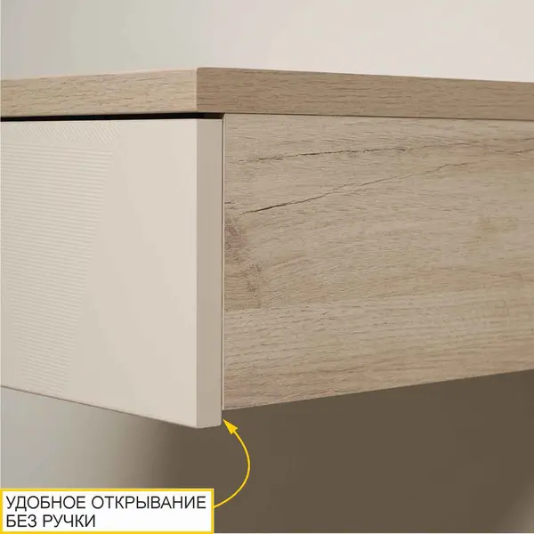 • Ящик туалетного столика подвесного легко и удобно открывается за счет свеса фасада. Отсутствие ручки подчеркивает современный дизайн мебели.