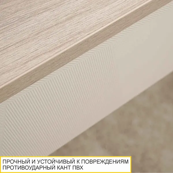 • Противоударный кант ПВХ толщиной 0,4 и 2 мм защищает края подвесного туалетного столика от сколов и влаги, увеличивает его срок эксплуатации и сохраняет внешний вид на долгие годы.