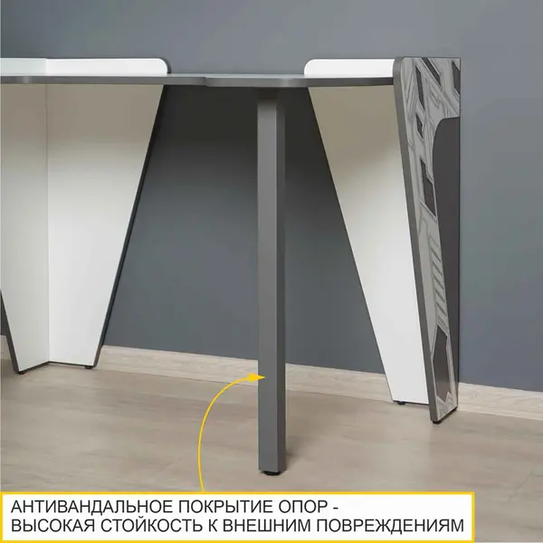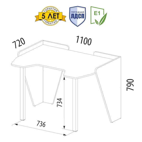 • Игровой компьютерный стол выполнен из материала ЛДСП 16 мм повышенной прочности, который устойчив к механическому истиранию и термическому воздействию. Выдерживает min 200 циклов истирания (по ГОСТу min 65).