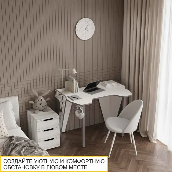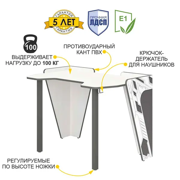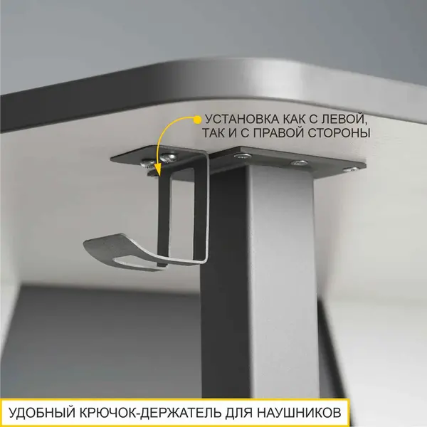 • Мы все предусмотрели, поэтому в комплекте к геймерскому столу идет крючок-держатель для наушников. Наушники всегда под рукой и при этом не мешают и не занимают много места на столе.