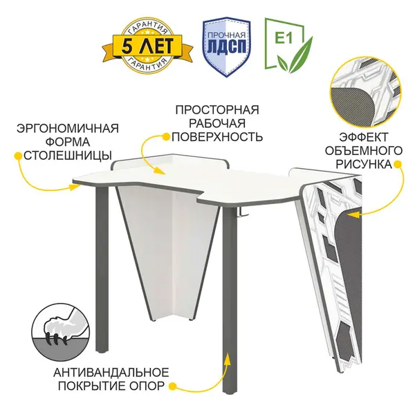 • На просторной рабочей поверхности можно комфортно разместить как компьютерное оборудование, так и канцелярские принадлежности. Удобное рабочее пространство обеспечивает комфорт и эффективность в процессе работы, учебы или игр.