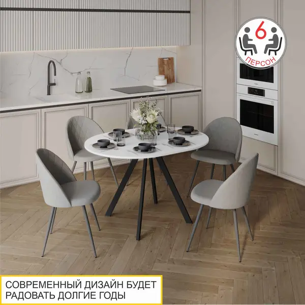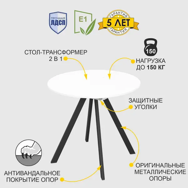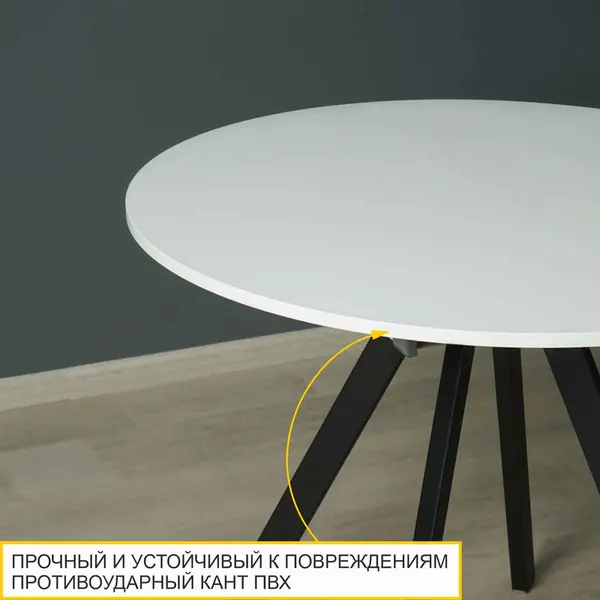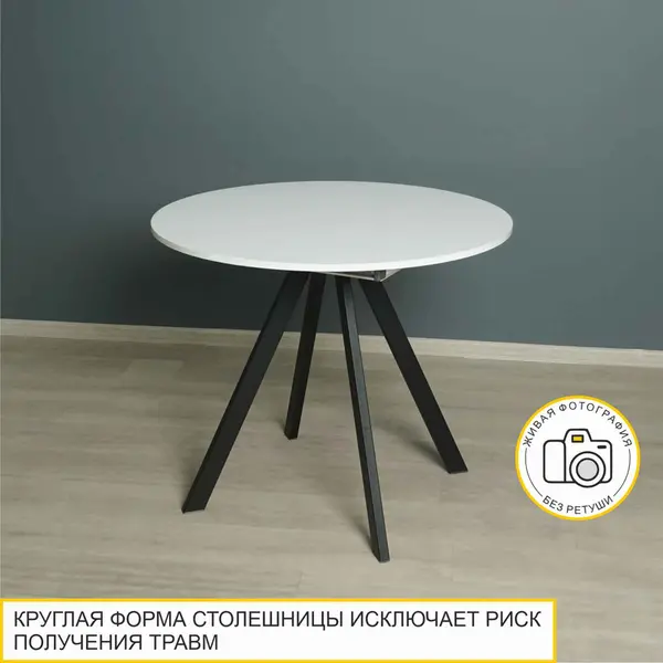 • Популярная круглая форма столешницы исключает риск получения травм, безопасна для маленьких членов семьи. Вам не придется защищать углы специальными накладками для острых углов.