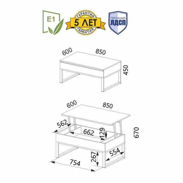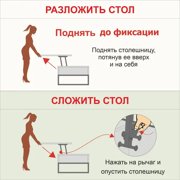 • За одну цену Вы приобретаете 2 стола! В сложенном виде – это компактный журнальный стол. А в разложенном виде надежный подъемный механизм увеличивает высоту стола на 22 см, что позволяет его использовать как обеденный или письменный стол.