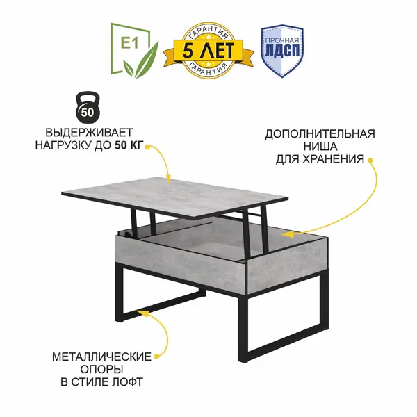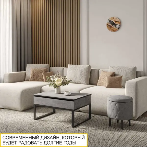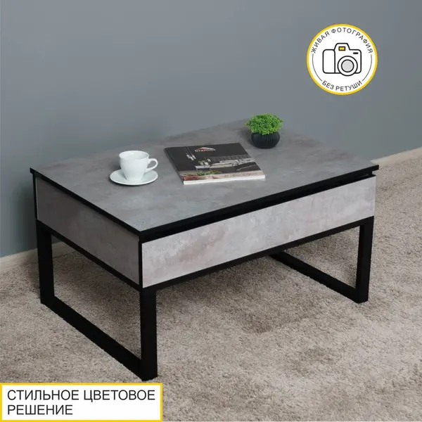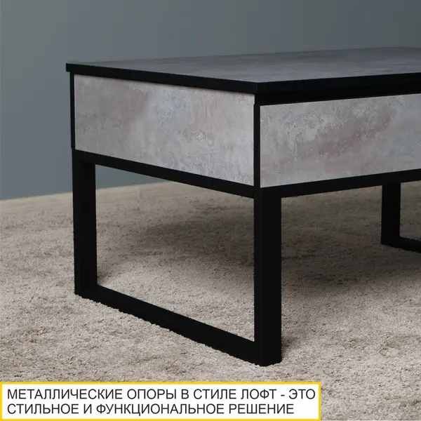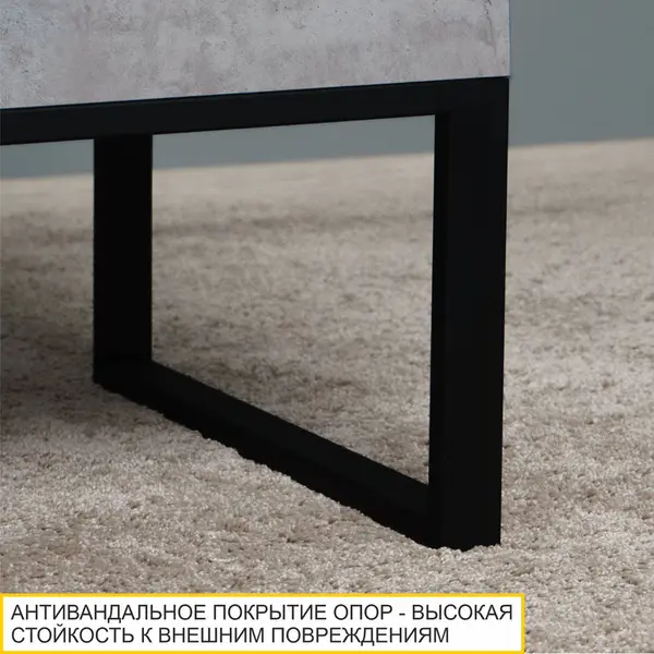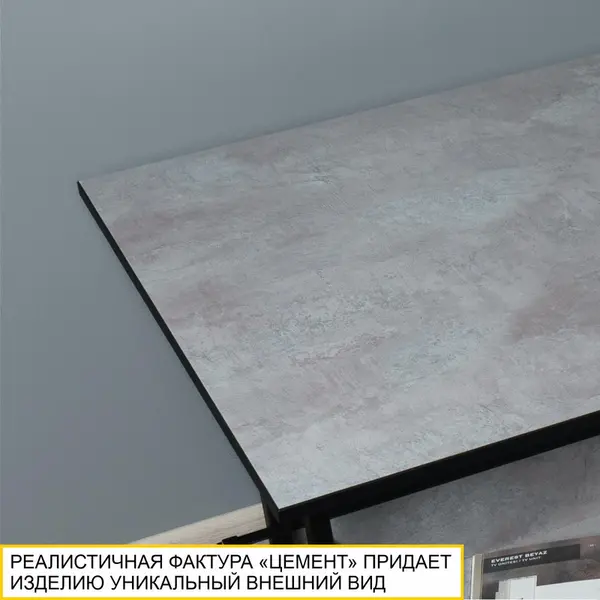 Реалистичная цементная фактура столешницы придает журнальному столику оригинальный внешний вид и отлично подходит для создания современного интерьера. Уникальная особенность стола – противоударный кант ПВХ черного цвета.