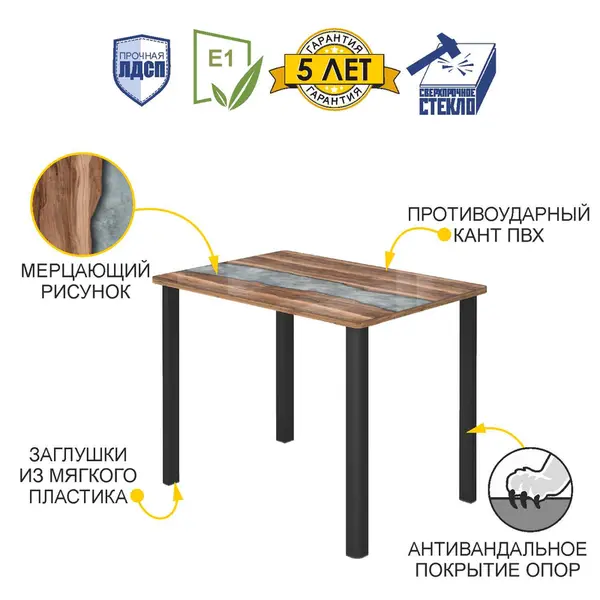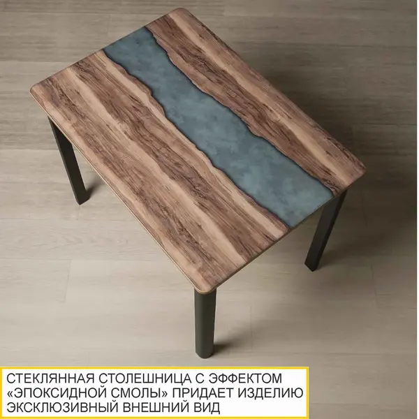• Стеклянная столешница с древесным рисунком и эффектом эпоксидной смолы добавляет обеденному столу оригинальности и придает изделию эксклюзивный внешний вид. Благодаря стеклу рисунок не стирается и не выцветает со временем.