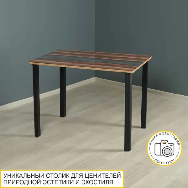 Стол кухонный с уникальной «серебристой рекой» на столешнице и черными металлическими опорами покорит сердце ценителей природной эстетики и экостиля.
