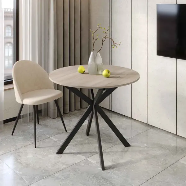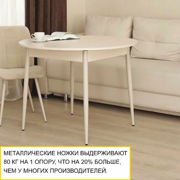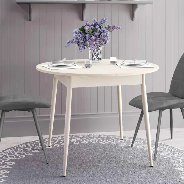 Раздвижной обеденный стол в универсальных оттенках натурального дерева, они отлично смотрятся в интерьерах любой цветовой гаммы, придавая им модную нотку экостиля. Столешница круглой формы цвета «Сосна Астрид» с имитацией легкой древесной текстуры создает ощущение уюта.