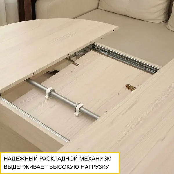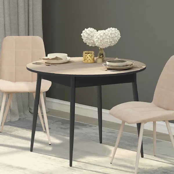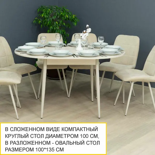 • За одну цену вы приобретаете 2 стола! В сложенном виде – это компактный круглый стол диаметром 100 см. Надежный механизм синхронного раздвижения и вставки-книжки позволит трансформировать столик во вместительный овальный стол с размером столешницы 100х135 см, что позволит разместить за столом до 8 персон.