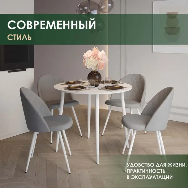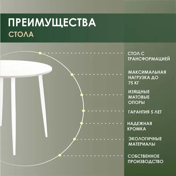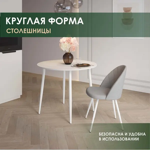 • Круглая форма столешницы — это отличный вариант для кухонного стола. Отсутствие острых углов делает его безопасным для маленьких детей и удобным для использования в небольших помещениях.