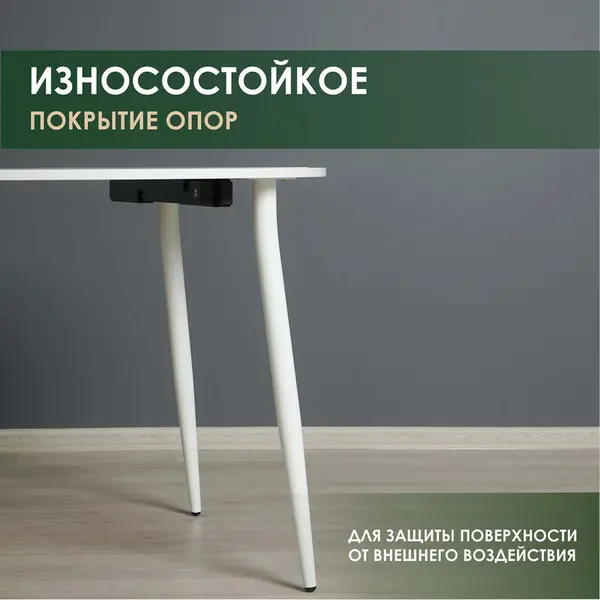 Белый цвет столешницы в сочетании с белыми металлическими опорами можно комбинировать с любыми другими цветами и фактурами. В то же время такой стол добавляет интерьеру свежести и визуально расширяет пространство.