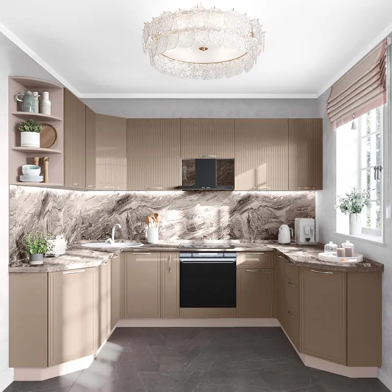 • Глянцевые фасады с оригинальной рамкой и актуальной фрезеровкой «рейки» поддерживают современный стиль, добавляя интерьеру ритмичности и утонченности.