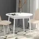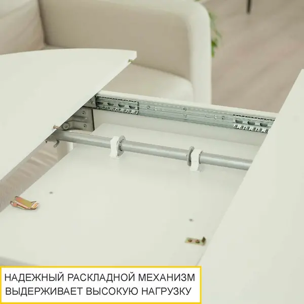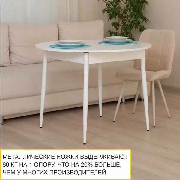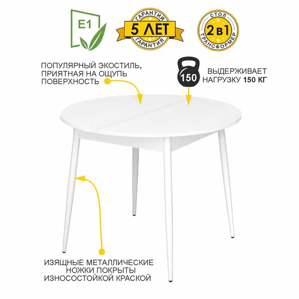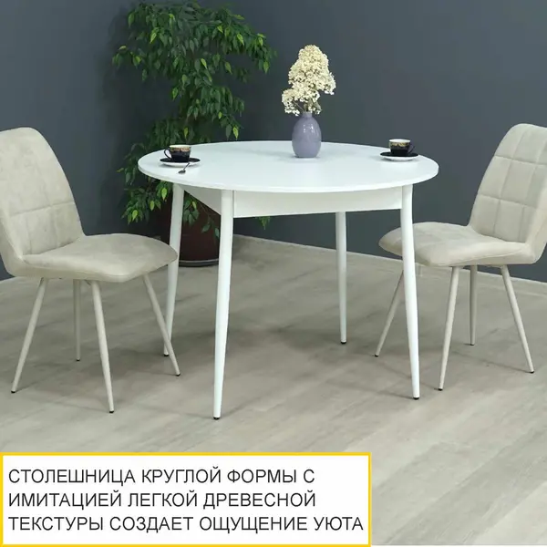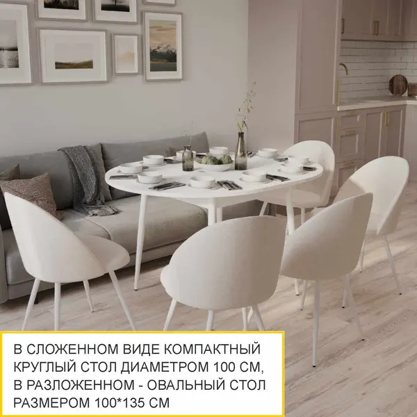Раздвижной обеденный стол выполнен в актуальном и универсальном белом цвете, его можно сочетать с любыми другими цветами и фактурами. В то же время он добавляет интерьеру свежести и визуально расширяет пространство. Столешница круглой формы цвета «Белый шпон» с имитацией легкой древесной текстуры создает ощущение уюта.