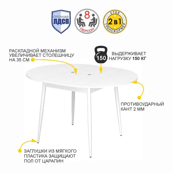 • За одну цену вы приобретаете 2 стола! В сложенном виде – это компактный круглый стол диаметром 100 см. Надежный механизм синхронного раздвижения и вставки-книжки позволит трансформировать столик во вместительный овальный стол с размером столешницы 100х135 см, что позволит разместить за столом до 8 персон.