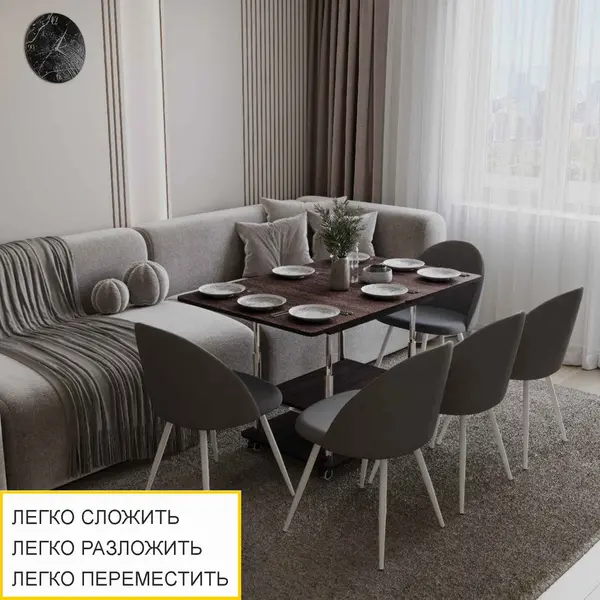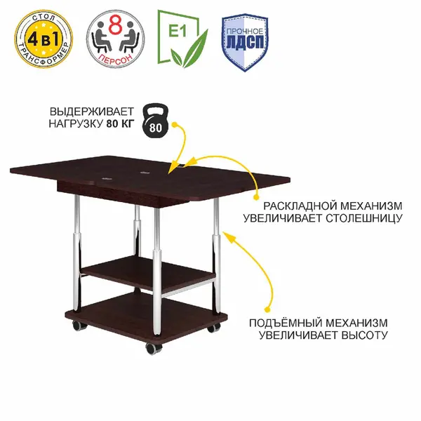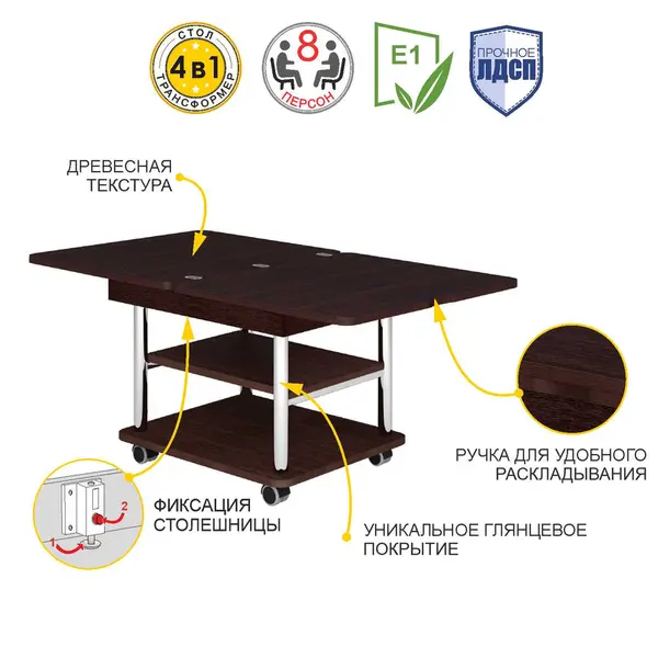 • Раскладной журнальный стол-трансформер легко превращается в обеденный или письменный стол и имеет четыре варианта трансформации. За одну цену Вы приобретаете 4 стола: 2 журнальных - один компактный, второй - с увеличенной столешницей, а также 2 обеденных стола – на 4 и 8 персон.