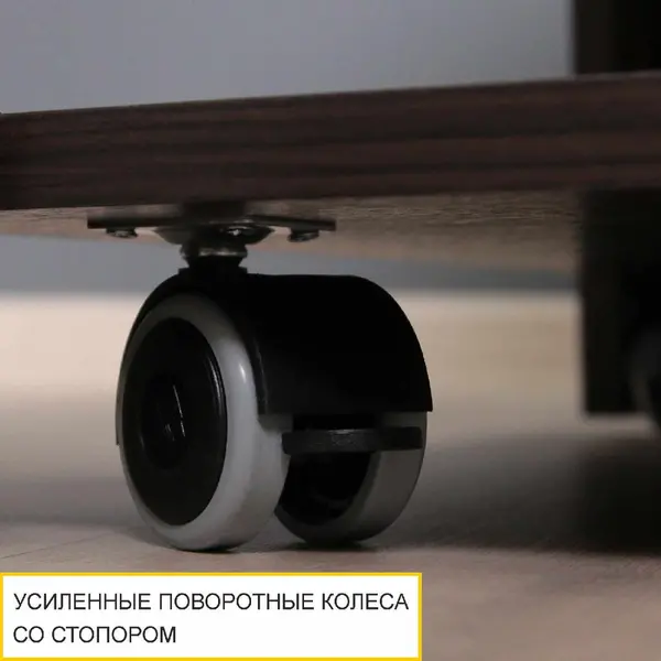 • Усиленные поворотные колеса со стопором позволяют зафиксировать стол в нужном положении для удобства его трансформации.