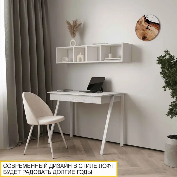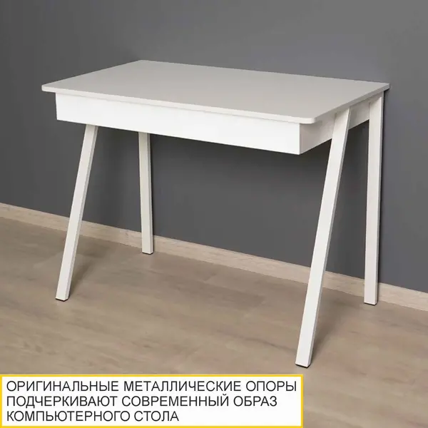 Стол компьютерный выполнен в белом цвете, который является актуальным и универсальным решением. Его можно сочетать с любыми другими цветами и фактурами. В то же время, он добавляет интерьеру свежести и визуально расширяет пространство.