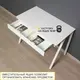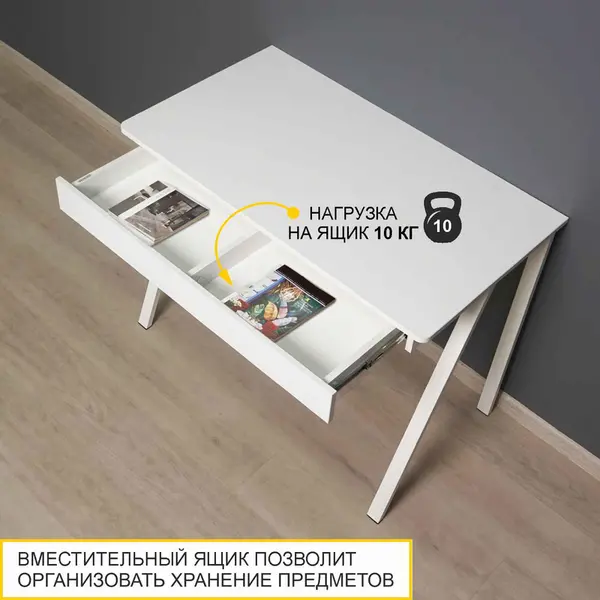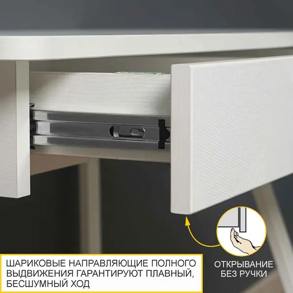• Отсутствие лицевой фурнитуры подчеркивает современный дизайн письменного стола с ящиком. Ящик легко и удобно открывается за счет свеса фасада.