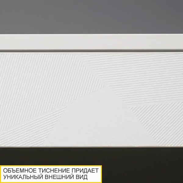 • Объемное тиснение на фасаде выдвижного ящика подчеркивает современный стиль изделия и добавляет ему оригинальности. Рельефный рисунок придает уникальный внешний вид Вашему изделию, а также обладает приятной на ощупь текстурой.