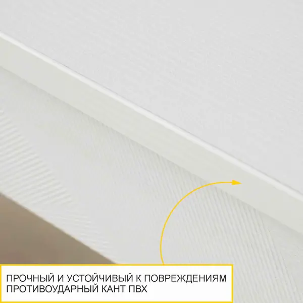 • Противоударный кант ПВХ 0,4 мм и 2 мм защищает края изделия от сколов и влаги, увеличивает срок эксплуатации изделия и сохраняет его внешний вид на долгие годы.